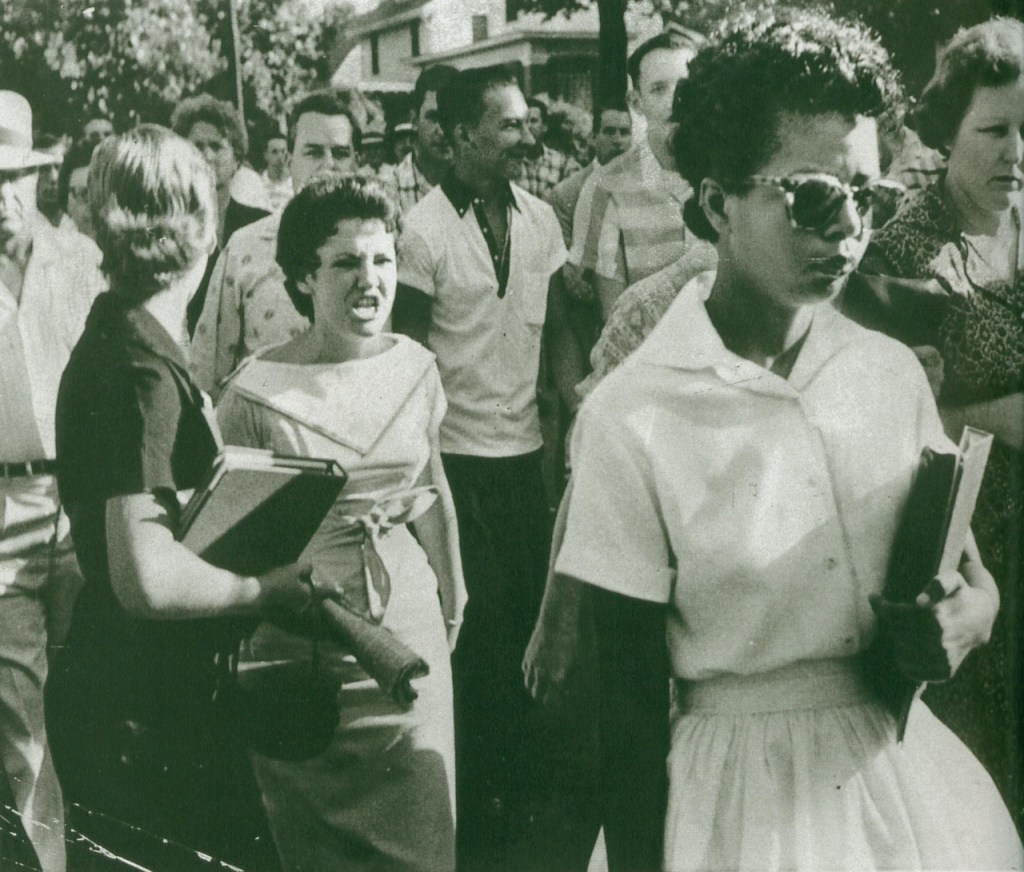 In the summer of 1957 nine African American families with high school age students decided to finally make good on the the promise of Brown vs. the Board of Education, Topeka, Kansas. In that case, decided in 1954, the Court ruled that schools segregated ‘de jure’ were unconstitutional. Southern States were reluctant to comply. The African American families met with members of the NAACP (National Association for the Advancement of Colored People) at the home of Daisy Bates that summer. They decided to desegregate Central High. The nine African American students would walk together to the high school and enroll…strength in numbers.