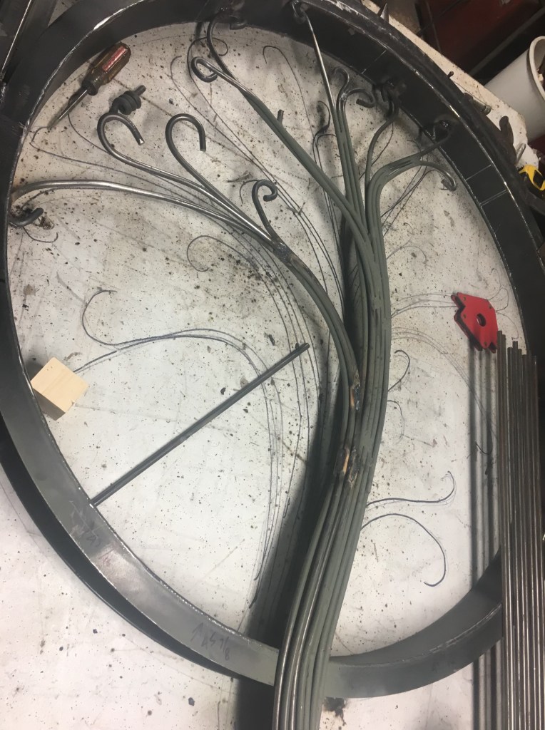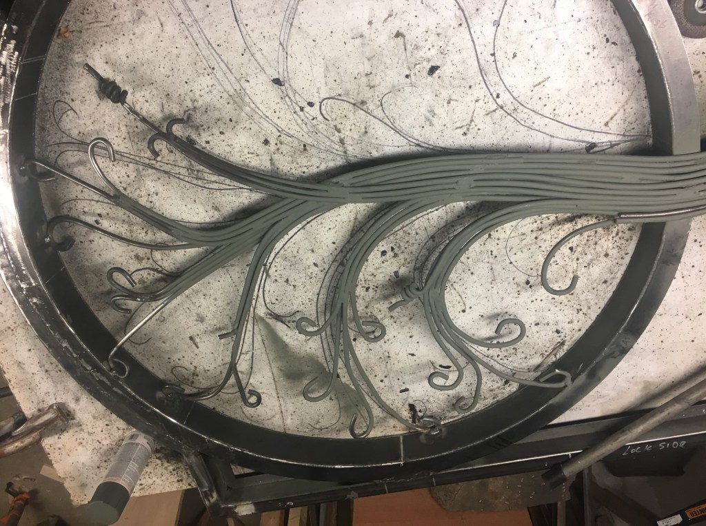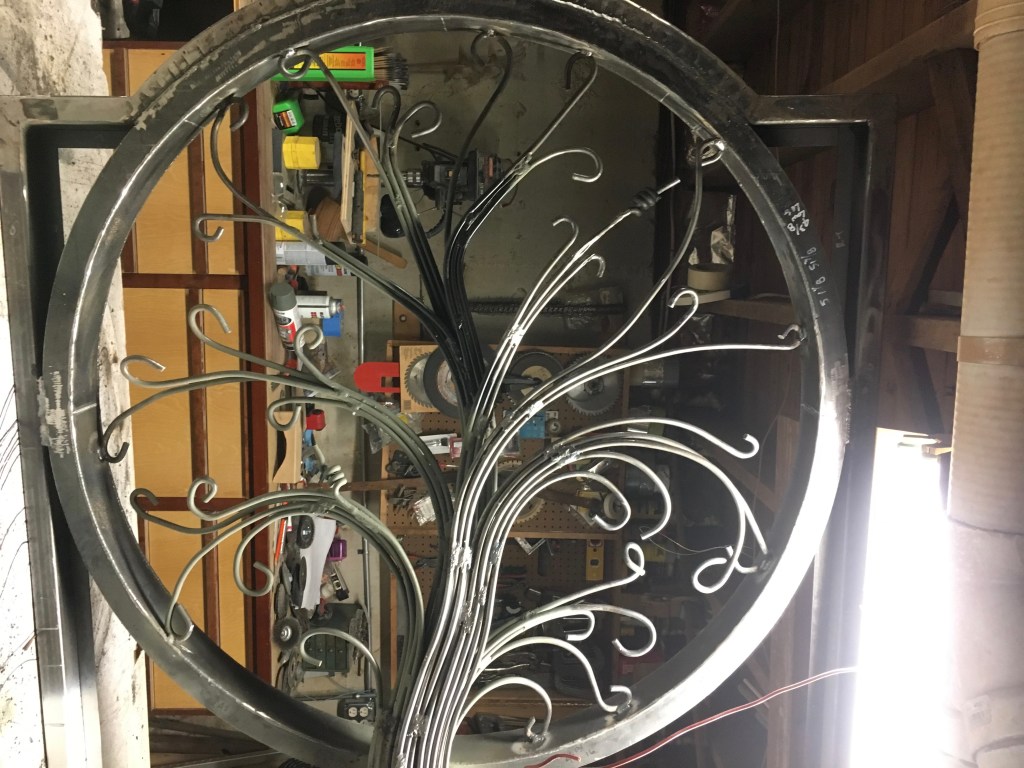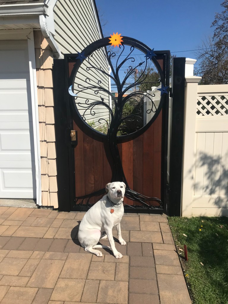 Winged FigureThicketCornstalk FenceGasparilla BenchDiscoveryRiver Bluff PavillionRestIn the Making – 1In the Making – 2In the Making – 3In the Making – 4My brother-in-law Bill Thompson’s creation — The Gate — with his dog OZZY. The docents and smiths at the National Ornamental Museum were completely taken by Bill’s work…”stunning” was the oft repeated response. They would hire him in a heartbeat but as Bill says, “done working for wages”. Bill has another claim to fame. He was part of a U.S./French crew which restored the Statue of Liberty in the 1980’s. The pictures Bill has of him and his fellow workers hanging from ropes as they repair holes and replace sheet metal on the outside of Statue dangling above the NY harbor are amazing.