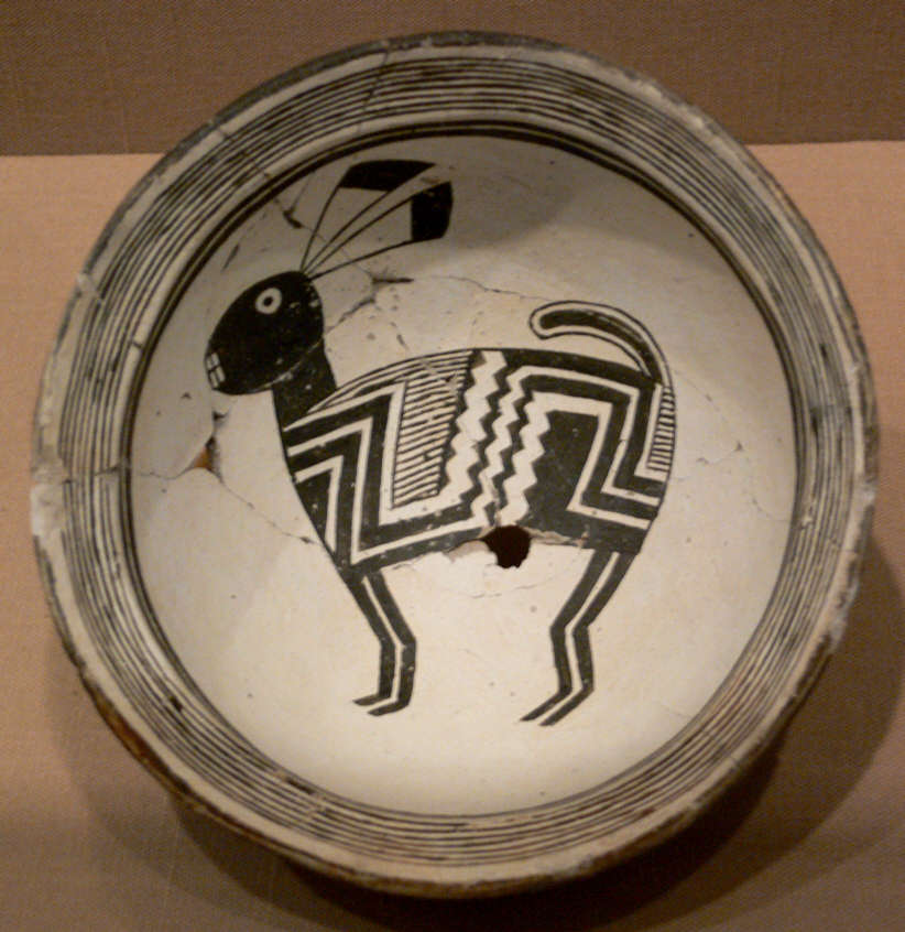 Mimbres Pottery is black on white. These early occupants of the Gila River Drainage in Southwestern New Mexico incorporated local fauna into their exquisitely painted pottery. Mimbres means ‘Little Willow’ in Spanish. The first evidence of Mimbres occupation dates to about AD 200. Their culture thrives from 900 – 1200 and then moved on during a drought that upended settlement in the Southwest during the 1200’s.