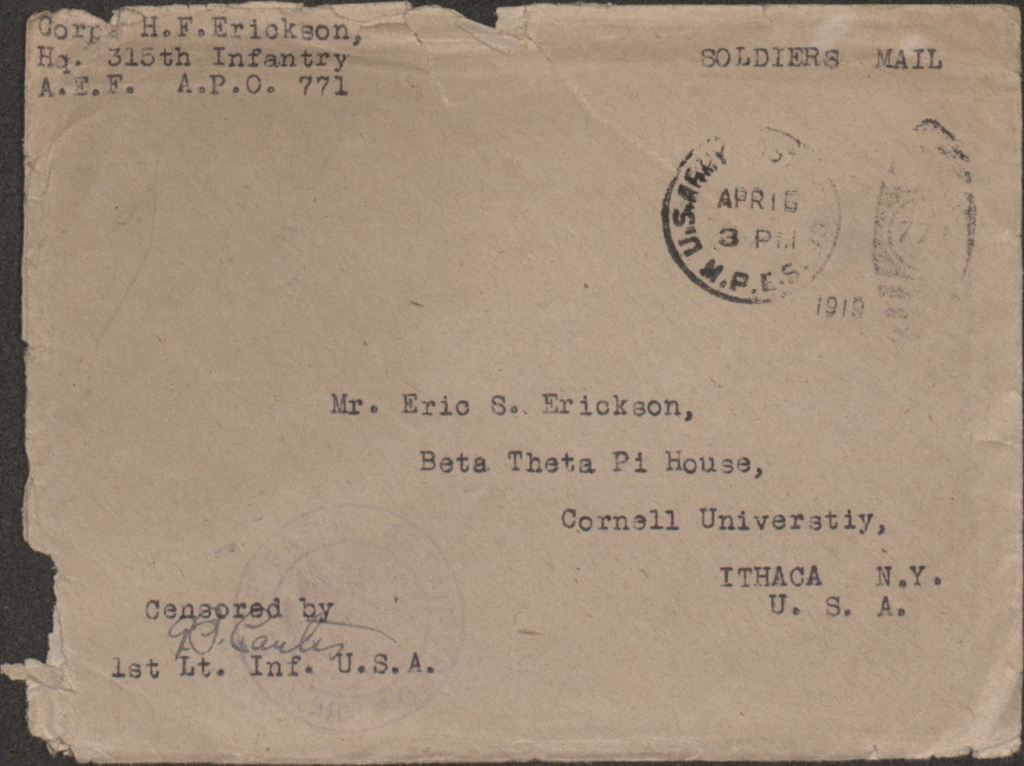 While Lloyd was training, my grandfather, Corporal Henry Fritz Erickson, was a Doughboy in France. His letter is addressed to his younger brother, Eric Sigfrid.