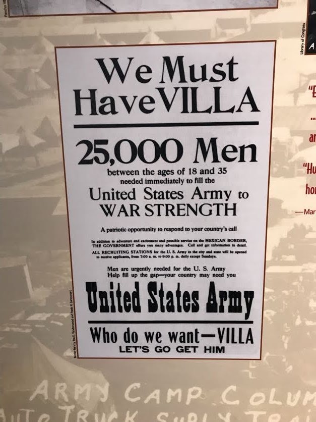 As dawn broke over Columbus, New Mexico (NM) on 9 March 1916, gunfire also broke the silence of the new day. Pancho Villa, born Doroteo Arango, and his Revolutionary Army of Northern Mexico were attacking this little NM town. They were seeking weapons to continue their fight for control of Mexico during the Mexican Revolution 1910 – 1921. The U.S. Army had a garrison at Columbus. Villa wanted their weapons and ammo. Villa had bad intelligence on the Columbus Garrison. He was told there were only 30 U.S. soldiers at the camp, there were actually over 100. Although outnumbered 6 – 1, the American soldiers had far better equipment which included the latest French manufactured machine guns. Ten U.S. soldiers and seven U.S. civilians were killed in the battle. Villa lost over 100 men.