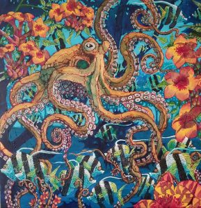 Christopher Hopping of Hopping Mad Art paints colorful scenes of life beneath the sea. We got to talking Octopus. Those amazing creatures are sure having their moment. Chris is an octopus aficionado.