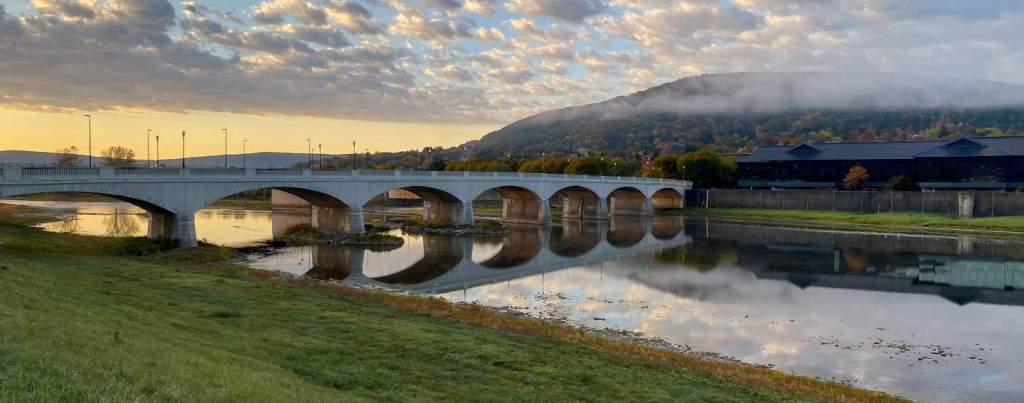 Centerway Bridge in Corning, NY, the original bridge across the Chemung River in Corning. The glass factory was on the Northside of the river, residences were on the Southside. In the 1980’s Centerway Bridge had outlived its usefulness. A new bridge was built to accommodate the bigger and heavier vehicles on the road. Centerway was to be demolished. Mary Ann’s dad led the charge to ‘Save Our Bridge’. Save it they did. To this day old timers in Corning call Centerway Bridge, Ted’s Bridge. It is now a pedestrian bridge connecting downtown Corning with the Corning Museum of Glass which is on the Northside. The factories are gone, The Glass Company Headquarters remain.