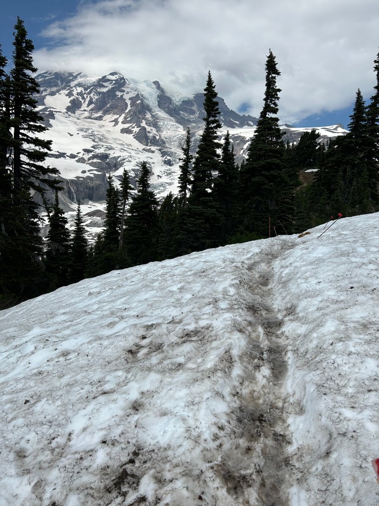 The trail up from Paradise Valley became a bit challenging. The backpackers we met on the trail who were coming down after a night at the summit all had the same comment, “freezing, wildly windy, no view”. We trekked on a ways.