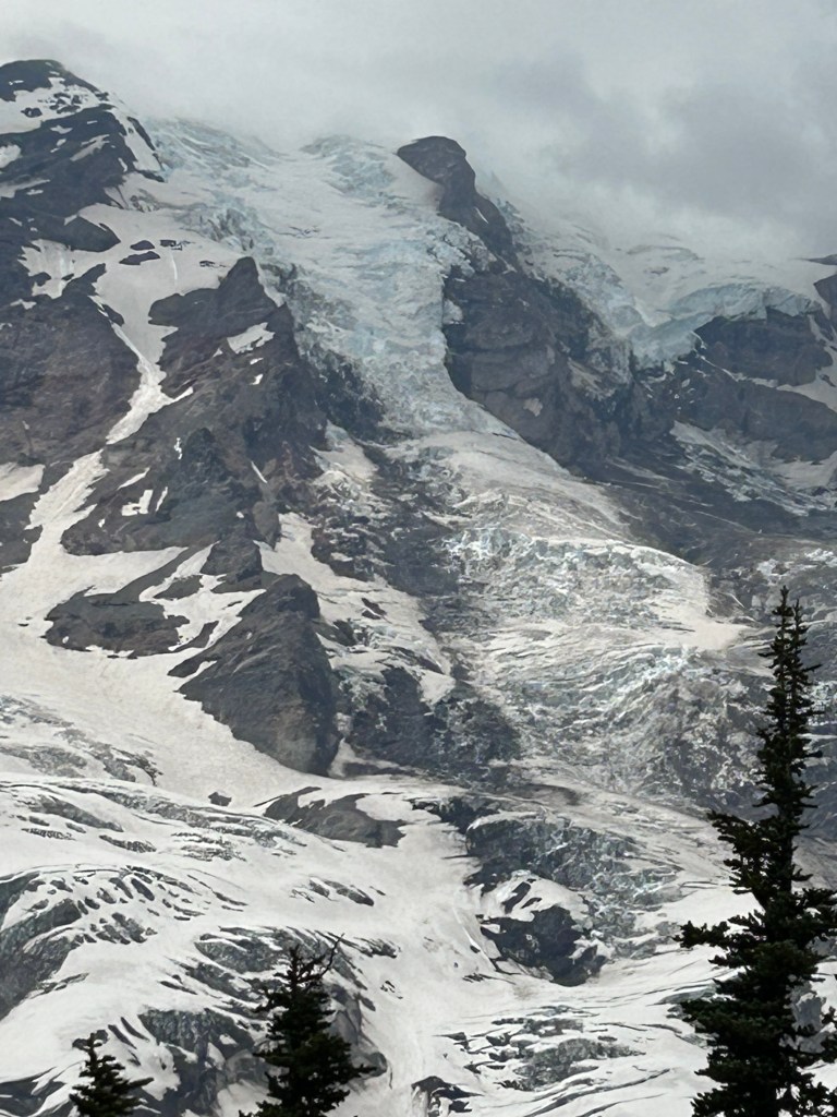 The Nisqually glacier is one of twenty-five in the park. Sadly, since 1982 Tahoma has lost 82 of its glaciers. The Nisqually Glacier has retreated 1500 feet since 1988. Five important Northwestern rivers have their headwaters on Tahoma.